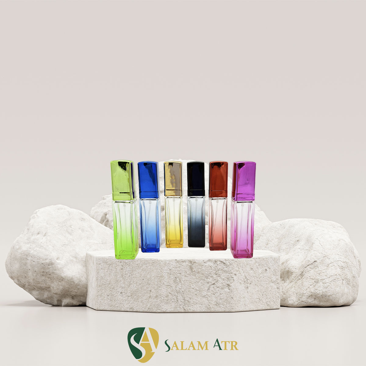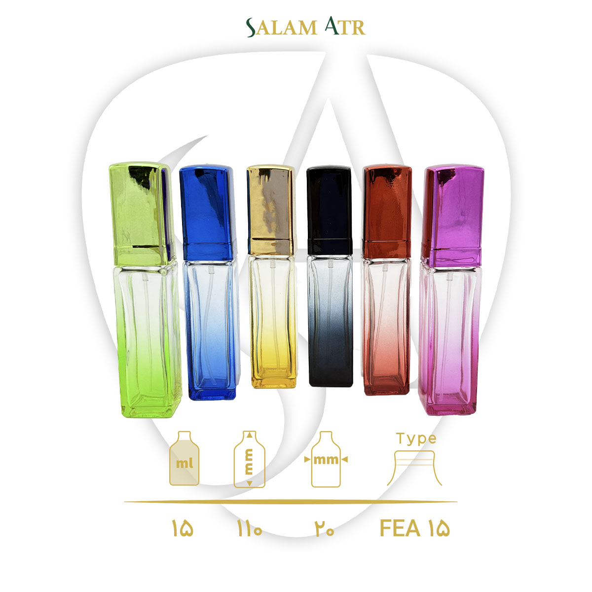 شیشه عطر آلفا رنگی ۱۵ میل در شش رنگ جذاب و پرکاربرد شامل صورتی، قرمز، مشکی، زرد، سبز و آبی عرضه می‌شود. این تنوع رنگی به برندها امکان می‌دهد رایحه‌های مختلف را به‌صورت بصری تفکیک کرده یا کالکشن‌های زنانه، مردانه و یونی‌سکس را از یکدیگر متمایز کنند.